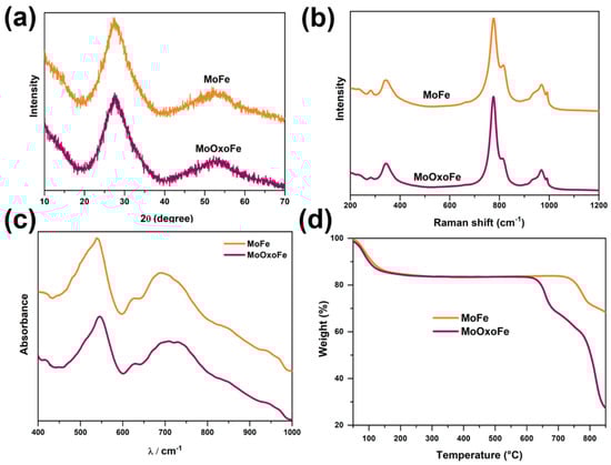Table S1 lists the molybdenum–iron molar ratio (Mo/Fe), as well as the specific surface area calculated by the BET method (SBET) for MoFe and MoOxoFe. Both of them showed similar values for the Mo/Fe ratio (~1.0) and SBET. The X-ray diffraction patterns indicated that these materials lacked long-range crystalline ordering, as shown in Figure 1a. The Raman spectra (Figure 1b) showed that MoFe and MoOxoFe did not have a marked difference. The most intense band of the spectrum, around 780 cm−1, was due to the Mo-O-Mo vibration of the molybdenum near the iron [20,21]. The band close to 820 cm−1 was generally attributed to the same vibration but further away from iron atoms [21]. The bands in the ranges of 310–370 cm−1 and 900–1000 cm−1 corresponded to the bending and stretching vibrations of Mo=O groups, respectively [20,21,22]. Furthermore, the absence of the band at 1045 cm−1 indicates that there was no ferric nitrate remaining on the surface of the iron molybdates [20,21].