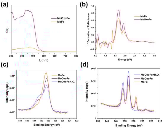 Kubelka-Munk function (a) and the 1st derivative of the DRS spectra (b) for MoFe and MoOxoFe. XPS spectra of O 1s (c) and Mo 3d (d) showing MoFe, MoOxoFe, and MoOxoFe with an extra loading of H2O2.