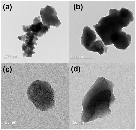 Transmission electron microscopy images, in different magnifications, for MoOxoFe (a,c) and for MoFe (b,d).
