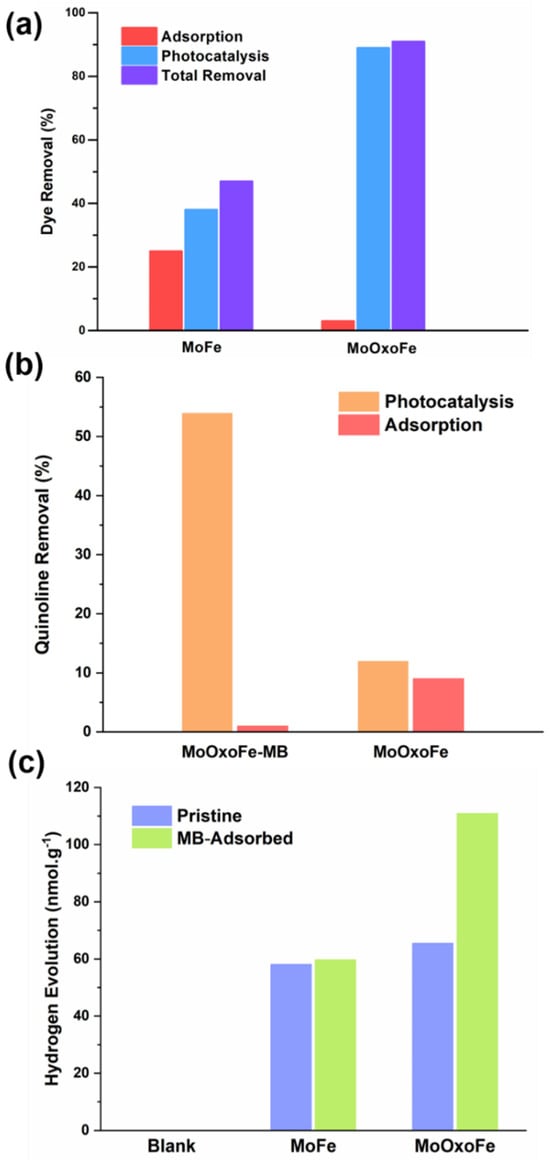 To investigate the supposed sensitization effect, a new photocatalytic test was performed with aqueous quinoline solution (carcinogenic contaminant from fossil resources) with pure MoOxoFe and the same material after one hour of adsorption (MB-adsorbed MoOxoFe, called MoOxoFe-MB). Figure 4b shows the quinolone removal after 30 min of adsorption and 60 min of photocatalysis in the presence of MoOxoFe and MoOxoFe sensitized with MB. As observed, the MoOxoFe-MB compound showed a much better photocatalytic efficiency by visible light, removing almost five times more quinoline via photocatalysis than pristine MoOxoFe. On the other hand, the MoOxoFe-MB adsorbed less quinoline (~1%), which is reasonable because its surface was covered by MB dye molecules. This result shows that the adsorption of methylene blue dye on the catalyst surface promotes surface sensitization, making the catalyst more efficient in photocatalytic processes to degrade different types of molecules.