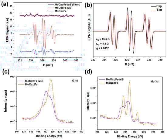 EPR spectra comparing MoOxoFe, MoOxoFe-MB, and adding Tiron in the MoOxoFe-MB test (a). Experimental and simulated EPR spectra for PBN (b). High-resolution O 1s (c) and Mo 3d (d) XPS spectra of MoOxoFe and MoOxoFe-MB.