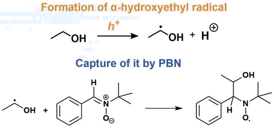 Production of the α-hydroxyethyl radical by the photogenerated hole, also resulting in the release of a proton and the subsequent capture of this radical by the spin trapping agent PBN.