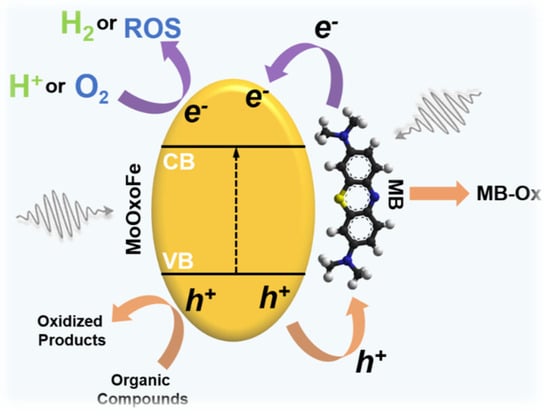 Further details were investigated on the interaction between MoOxoFe and MB using XPS again; this was accomplished by looking to MoOxoFe and MoOxoFe-MB (Figure 5c,d), using O 1s and the Mo 3d XPS spectra. First of all, these samples had different intensities, which was reasonable, since the presence of the adsorbed dye reduced the photoelectron emissions emitted by the surface atoms of the material. In other words, the dye molecules were diluting the amount of the ejected electrons of MoOxoFe. In addition, there was a shift towards higher binding energies when MB was present. For the characteristic doublet of Mo6+, 232.8 eV (3d5/2) and 235.9eV (3d3/2), there was a variation of 0.8 eV from one sample to another, suggesting that sensitization affected Mo6+ by withdrawing its electron density, thus increasing the photoejection energy. In the case of oxygen, the same effect existed, and there was an inversion in the intensity profile. The dominant peak for MoOxoFe was at 530.5 eV, and for MoOxoFe-MB, it shifted to 532 eV, which was just a weak shoulder for the pristine material. This surface nature modification was the strongest evidence of an intimate semiconductor–dye interaction [56] and the idea of sensitization and enhancement of photocatalytic performance for MoOxoFe. In order to represent the idea of the reaction mechanism and interaction between MoOxoFe and MB, a scheme was elaborated, and it can be seen in Figure 7.