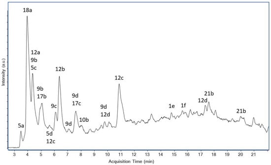 | d | C21H24N3+ | 330.1965 | 330.1950 | 11.99; 13.04; 13.50; 13.88 | 1.2 × 107 | ++ | |