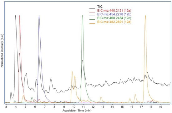 | 12 | a | C31H26N3+ | 440.2121 | 440.2107 | 4.37 | 6.5 × 107 | ++ |