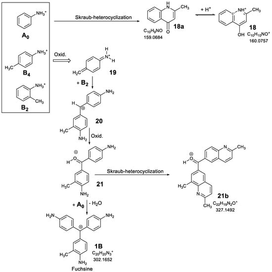 - Plater, M.J.; Raab, A.; Hartmann, H. Liquid chromatography-mass spectrometry analysis of cationic aniline dyes from the Technical University of Dresden historical collection of dyes. J. Chem. Res. 2020, 44, 326–335. [Google Scholar] [CrossRef]