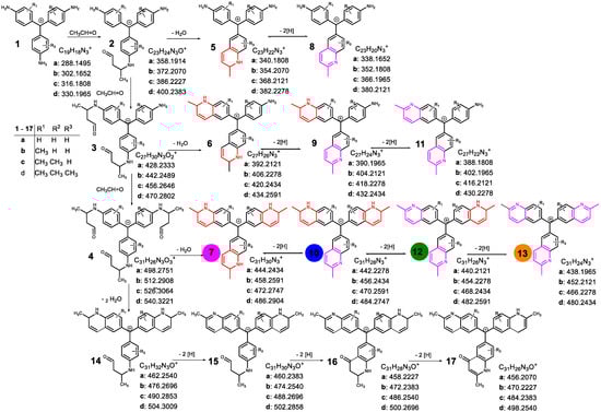 | d | C34H32N3+ | 482.2591 | 482.2572 | 9.79; 10.07; 17.36 | 4.8 × 107 | ++ | |