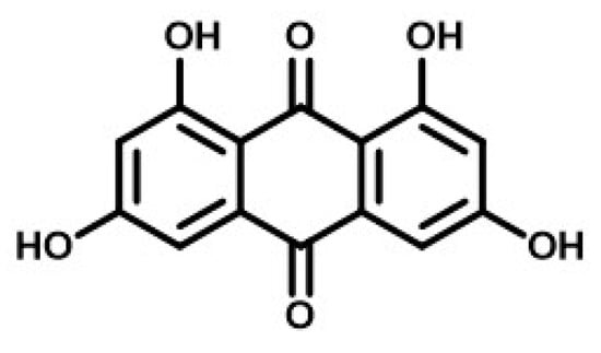 Anthraquinones are one class of natural colorants which give bright purple, maroon, and blueish shades of red and are derived from many different parts of the plants. Hence, they have found many uses as natural colorants [115]. Emodin (the chemical structure of which is shown in Figure 3) is one specific kind of anthraquinone known for its color and medicinal properties. It is found in various parts of many plants like Senna alata (Cassia alata) [116], Rumex abyssinicus [117], Odontites serotine [118], Reynoutria japonica [119], and Polygonum cuspidatum [120]. Although, the most common source of emodin for us is from rhubarb [121].