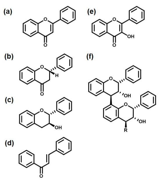 Six classes of flavonoids: (a) Flavone, (b) Flavanone, (c) Flavan-3-ol (catechin), (d) Chalcone, (e) Flavanol, and (f) Flavolan.