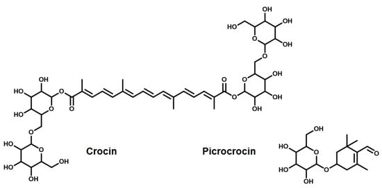 In one of the earlier studies, crocin-soaked disks were incubated with various microbial species. Of the many species tested, crocin showed antimicrobial activity against only S. epidermidis, a pathogenic organism [147], showing its valuable use in cosmetics, especially as a face cream. Due to its excellent inhibition properties against S. epidermidis, it was used in other similar studies [148,149,150,151]. In another study, Jinous et al., reported the antibacterial activity of saffron at higher concentrations (1000–31.2 mg/mL) [150]. Though saffron may not have extraordinary antibacterial activity, yet it has extensive medicinal values. And, we thought it would be beneficial for the readers to have this information. The source of this information is uncertain, but saffron has been used in folk medicine as an antispasmodic, eupeptic, gingival sedative, anticatarrhal, nerve sedative, carminative, diaphoretic, expectorant, stimulant, stomachic, aphrodisiac, and emmenagogue. Its active constituents have anticonvulsant, antidepressant, anti-inflammatory, and antitumor properties; it acts as a radical scavenger as well as exhibits learning- and memory-improving properties by promoting the diffusivity of oxygen in different tissues. In a conclusive study, the two active ingredients of saffron—crocin and safranal—were shown to have antidepressant effects [24]. Apart from that, the crocin, picrocrocin, and safranal have been shown to inhibit the growth of human cancer cells (HeLa cells) in vitro [152]. Carotenoids, in general, are well known for promoting eye health. Saffron is no different, it has been shown that crocin and its analogs increase the blood flow in the retina and choroid as well as facilitating retinal functional recovery, and it could be used to treat ischemic retinopathy and/or age-related macular degeneration [153].