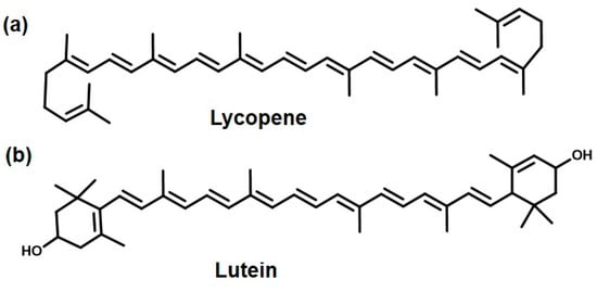 Another important carotenoid is lycopene. It is a favorite natural colorant in the food industry, mainly due its bright color and nutritional value [154]. Lycopene is found in various fruits like tomatoes, melons, papaya, and red bell peppers [155]. Tomatoes contain the highest amount of lycopene [156], making up 65–98% of the total amount of carotenoids in tomatoes. The other carotenoids present in tomatoes, in addition to lycopene, are α- and β-carotene, lutein, zeaxanthin, and b cryptoxanthin. Β-carotene, the yellow pigment of the carrot, is an isomer of lycopene [24,157]. The chemical structure of lycopene is shown in Figure 6a. Lycopene consists of highly unsaturated long-chain alkenes. The conjugated double bonds are responsible for its bright red color and its antioxidant activity.