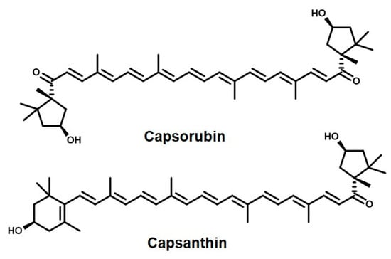Another class of common carotenoids used as natural colorants comes from paprika. Paprika, also known as sweet pepper, belongs to the family of Solanaceae and is the most cultivated species of the genus capsicum. The natural red color of paprika is widely used in food products like meat, dairy, cheese, soups, sauces, and snacks. The active ingredients of paprika are known for their antioxidant, antiviral, antimicrobial, anticancer, and anti-inflammatory properties [163]. The main active ingredients of paprika which impart it with its particularly strong red color and the above medicinal properties are capsanthin and capsorubin—see Figure 7. They are collectively called capsaicinoids [24,164].