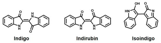 Indigo is a well-known natural dye that produces a blue color. Indigo, as a natural colorant of textiles, has been used in India since ancient times and its popularity soon spread in China through the Silk Route [201]. China applied this natural dye not just in the textile industry but in calligraphy as ink, in paintings, and most importantly in pottery, hence the world famous “blue china” crockery. In India, indigo powder is still commonly used in every household as a finishing product on white clothes and as an additive in limewash for interior and exterior wall paint. Indigo is obtained from the stems and leaves of the tree Baphicacanthus cusia (Neel) Bremek. The product is used in the form of either paste or, for more convenient use, as a powder. The active ingredients responsible for the blue color of this dye and for its medicinal properties are indigo and indirubin (Figure 9). Modern researchers, especially in the textile industry, proved indigo’s many medicinal properties, like it being anti-inflammatory, antioxidant, an immune regulator, antimicrobial, etc. [202,203].