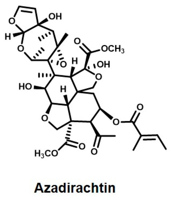 Neem leaves and bark are one of Nature’s many blessings. The red–brown color extracted from the bark of the tree has been used as a natural colorant. The strong antimicrobial properties of neem have been known about since ancient times [212]. Neem has been shown to contain at least one hundred and forty bioactive compounds used primarily for their pesticidal properties [213]. The neem plant is a native of India and its chief active ingredient is azadirachtin (Figure 10), hence the scientific name Azadirachta Indica. Some of the other chief bioactive components of neem are sodium nimbinate, nimbin, nimbolin, nimbidol, gedunin, and solanine; whereas, neem leaves contain compounds like nimbolide, 7-deacetyl-7-benzoylazadiradione, 17-hydroxyazadiradione, amino acids, nimbandol, and nimbolide [214].