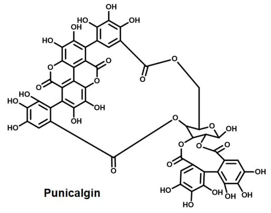 Pomegranate is a common fruit used worldwide. The medicinal value of pomegranate is evident in a saying, which means ‘one pomegranate and hundreds sick’. The scientific name of pomegranate is Punica granatum and it belongs to the family Punicaceae [227]. A class of natural dyes, anthocyanins, specifically pelargonidin glycosides, delphinidin, and cyanidin, are common components of pomegranate. These specific anthocyanins are responsible for the attractive red–purple color of pomegranate juice. Also, since they are phenolic in nature, they are readily soluble in water [24,228]. The chief components include punicalagin (Figure 11), punicalin, gallagic, and ellagic acids, and alkaloids like isopelletierine [229].