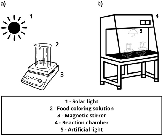 Schematic diagram of the photocatalytic apparatus for food coloring degradation: (a) Under solar light. (b) Under artificial light.