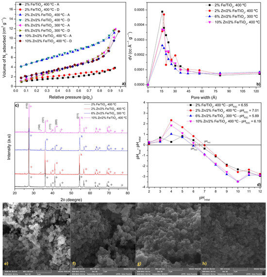 Catalyst characterization results: (a) N2 adsorption/desorption isotherms; (b) BJH pore size distribution; (c) XRD pattern; (d) Surface charge distribution; SEM micrographs at 30,000× for: (e) 2% Fe/TiO2; (f) 2% Zn/2% Fe/TiO2; (g) 6% Zn/2% Fe/TiO2; and (h) 10% Zn/2% Fe/TiO2. Legend—XRD peak phases: + TiO2 (Rutile), × TiO2 (Anatase), − Fe2O3 (Hematite), ° Fe3O4 (Magnetite).