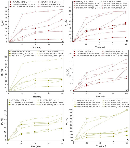 In summary, the best catalyst for AR photodiscoloration was 10%Zn/2%Fe/TiO2 calcined at 200 °C, achieving values close to 95.6% at pH 4. For TY photodiscoloration, the best catalysts were 6%Zn/2%Fe/TiO2 calcined at 300 °C and 10%Zn/2%Fe/TiO2 calcined at 200 °C, achieving values close to 99.9% and 95.6%, respectively. These results highlight the influence of both catalyst composition and calcination temperature on the efficiency of photodiscoloration, with optimal performance observed at specific pH conditions for each food coloring.