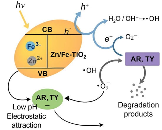 The photodegradation mechanism of dyes Allura Red (AR) and Tartrazine Yellow (TY) by TiO2 catalysts co-doped with Zn and Fe involves a series of photo-induced processes that promote the generation of reactive oxygen species (ROS). Under conditions of irradiation, the photocatalyst absorbs photons and generates electron–lacuna pairs (e−/h+). The doping of Zn2+ has been shown to modify the band structure and enhance light absorption, while Fe3+ functions as an electron trap through the Fe3+/Fe2+ redox cycle, thereby promoting charge separation and reducing recombination. The excited electrons react with molecular oxygen, thereby generating superoxide anions (-O2). Concurrently, the gaps participate in the oxidation of water or hydroxyl ions, which results in the formation of hydroxyl radicals (-OH). These ROS promote the oxidative degradation of the dyes adsorbed on the catalyst surface.