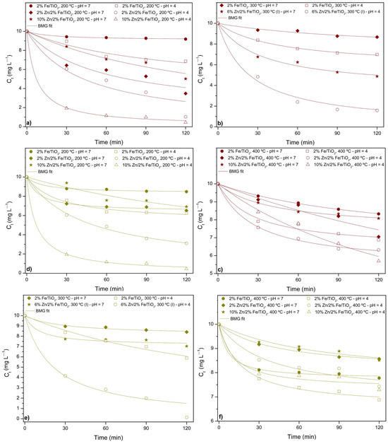 BMG kinetic curves for photocatalytic assays with catalysts calcined at (a) 200 °C, (b) 300 °C, (c) 400 °C for Allura Red solution, and (d) 200 °C, (e) 300 °C, (f) 400 °C for Tartrazine Yellow solution. Legend: open symbols (pH 4), closed symbols (pH 7).