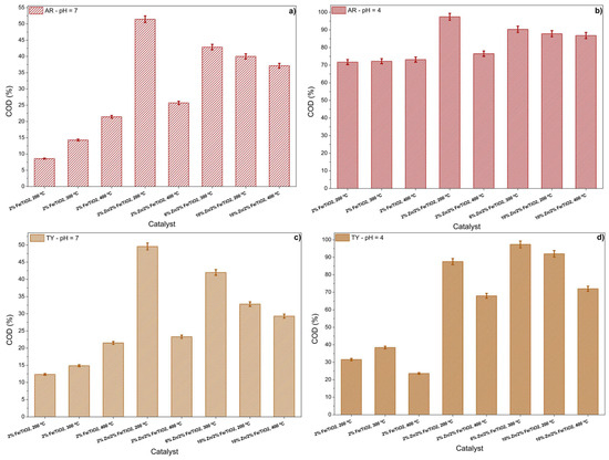 It was observed that in the tests conducted at pH 7 for both AR and TY (Figure 6a and c), the maximum COD reduction was approximately 50%, achieved using the 2%Zn/2%Fe/TiO2 catalyst calcined at 200 °C for both food colorings. This reinforces the fact that neutral pH conditions hinder the catalysts’ ability to break down food coloring molecules into compounds with a lower organic load. However, under more acidic conditions (pH 4), both food colorings exhibited COD reductions exceeding 95% (Figure 6b and d). For AR, the most effective catalyst was again the 2%Zn/2%Fe/TiO2 calcined at 200 °C, while for TY, the best performance was observed with the 6%Zn/2%Fe/TiO2 catalyst calcined at 300 °C. These results demonstrate that the synthesized materials can effectively degrade a wide range of food colorings, breaking them down into compounds with lower organic loads and potentially harmless byproducts.