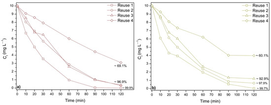 The food coloring concentration was readjusted to its initial value before each cycle. All catalysts exhibited a significant decline in performance from the first to the last cycle. For AR (Figure 7a), the first reuse achieved approximately 99.9% degradation, while by the fourth cycle, this value dropped to around 69%. Similarly, for TY (Figure 7b), the first reuse resulted in approximately 99.7% degradation, decreasing to about 60% in the fourth cycle.