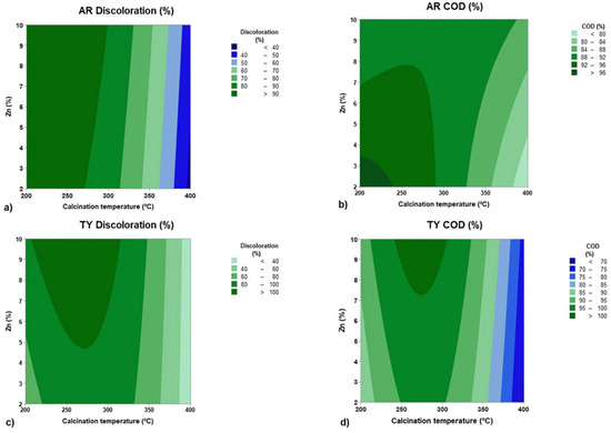 Level curves were generated for the statistically valid variables (Figure 8). The AR discoloration percentage was maximized at a lower temperature range, in the dark greenish region between 200 and 270 °C (Figure 8a), independent of Zn % variation. This result suggests that calcination temperature is the dominant factor influencing the discoloration of Allura Red solutions. However, for AR COD reduction (Figure 8b), the highest values were achieved at the lowest calcination temperatures (between 200 and 240 °C) and the lowest Zn % (between 2 and 3.5%).