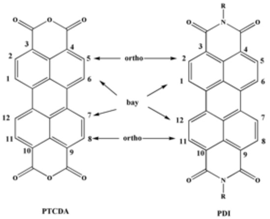 A generic chemical structure for PTCDA and PDI derivatives with the various positions in the chemical structure for functionalization.