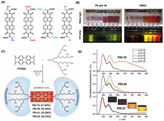 Chemical structures for various water-soluble PDI derivatives with anionic groups on imide positions. (A) Molecular structures of the PDIs functionalized with amino acids. PDI-Thr (L-threonine, PDI-15), PDI-Asp (L-aspartic acid, PDI-16), PDI-Met (L-methionine, PDI-17), and PDI-Cys. (L-cysteine, PDI-18). (B) A visual comparison of the four amino acids-functionalized PDI derivatives in PBS and DMSO at two concentrations, observed under white light and UV illumination (λ = 365 nm). (C) Synthetic scheme for the polyglycerol-functionalized PDI derivatives (19-21) and showing the structure for PDI-20. (D) The fluorescence measurements of PDI-19 (top), PDI-20 (middle), and PDI-21 (bottom) were recorded across concentrations ranging from 10−4 M to 10−7 M with an excitation wavelength of 490 nm. The inset displays a photograph of PDI solutions (19–21, labeled [G1]–[G4] from left to right) under UV light illumination at a concentration of 1.43 × 10−4 M. Reproduced with permission from [55,56], 2016, Elsevier; and 2010, RSC Publishing group.