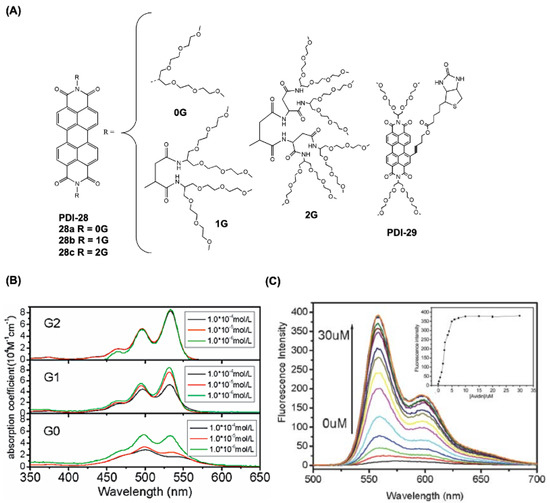 (A) Chemical structure for PDI derivatives 28-29 with PEG water-soluble groups on the backbone. (B) Concentration-dependent absorption spectra for PDI-28a-c. (C) The fluorescence spectrum of PDI-29 (10 μM) exhibits changes upon incremental addition of avidin (0–30 μM), with the inset displaying the corresponding fluorescence titration curve. Reproduced with permission from [66,67], 2011 and 2013, RSC Publishing group.