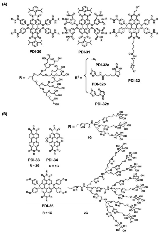 (A) Chemical structure for the PDI derivatives PDI-30-32 having polyglycerol dendrons in the bay region. (B) Chemical structure for PDI-based glycodendrimers (PDI-33-35). Reproduced with permission from [7], 2016, RSC Publishing group.