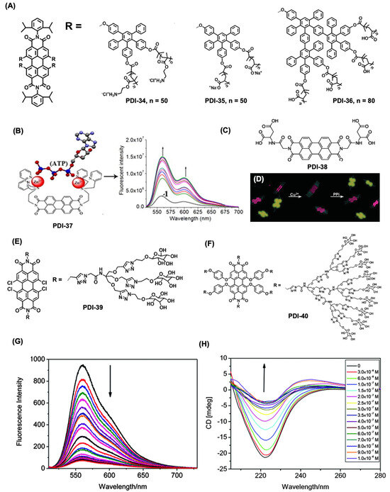 PDI derivatives for biosensing applications. (A) Chemical structure for PDI-34-36 used for the detection of DNA using the fluorescence property from the PDI assemblies. (B) Chemical structure for the PDI-37 molecule and its working principle for the ATP detection based on turn-on fluorescence. Arrows indicate the increase in fluorescence intensity for PDI-37, with the addition of ATP. (C,D) represent the chemical structure for PDI-38 and a schematic diagram for the detection of Cu2+ and PPi depending on the off-on fluorescence from PDI-38. (E,F) Chemical structure for PDI-39 and 40 for the detection of Con A. (G) Changes in fluorescence spectra of PDI-39 with ConA. Arrow indicates the decrease in fluorescence for PDI-39 at 560 nm with the addition of ConA. (H) Changes in CD spectrum for PDI-40 with added conA. Arrow indicates the decrease in secondary-structure of ConA with the addition of PDI-40. Reproduced with permission from [72,86,87,88], 2012, Elsevier; 2013, American Chemical Society; 2013, RSC Publishing group.