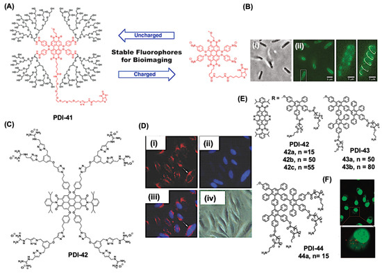 Chemical structures of PDI-41-44 for bioimaging applications. (A) Chemical structure and (B) bright-field (i,ii) fluorescence images of E. coli labeled with PDI-41 after preincubation with streptavidin. The right panel displays a magnified view of the white box from the central panel, emphasizing the helical arrangement of λ receptors in a single cell. (C) Chemical structure and (D) fluorescence microscopy images of HeLa cells incubated with PDI-42 for 24 h, showing red fluorescence in the cytoplasm (i) and DAPI-stained nuclei (ii). Merged (iii) and bright-field (iv) images highlight ongoing cell division. (E) Chemical structures of PDI-42-44 and (F) PDI-43a (red) penetrating ECV-304 cells stained with a green fluorescence tracker. Reproduced with permission from [68,94,95], 2011, American Chemical Society; 2013, RSC Publishing group; 2008, American Chemical Society.