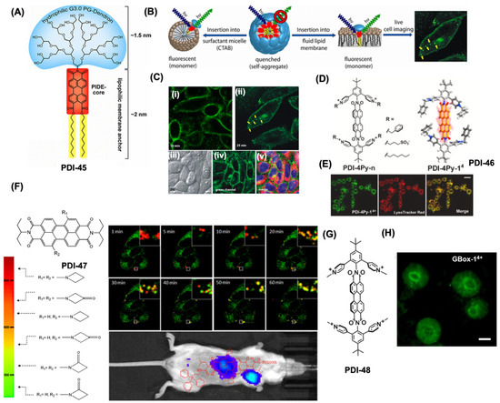 (A) Chemical structure of amphiphilic perylene dye PDI-45 for biological membrane imaging. (B) Schematic of self-quenching and monomerization in different environments for PDI-45 dye. (C) Confocal images of CHO cells incubated with PDI-45: (i) 10 min incubation labels the plasma membrane, (ii) 25 min incubation shows endocytic uptake, with vesicles (yellow arrows) likely trafficking to the Golgi. (iii–v) Co-staining with BODIPY-TR (red) for intracellular membranes and DAPI (blue) for nuclei shows colocalization at the Golgi (yellow). Yellow arrows indicate colocalization of BODIPY with PDI-45. (D,E) PDI-46 structure and fluorescence colocalization with LysoTracker Red in RAW 264.7 cells (scale: 25 μm). (F) PDI-47 structure with tunable NIR emission via azetidine substitutions, confocal imaging in HeLa cells, and in vivo tumor imaging. (G,H) PDI-48 structure and RAW 264.7 cell imaging application (scale: 5 μm). Reproduced with permission from [96,97,98,99], 2013, American Chemical Society; 2025, Elsevier; 2024, American Chemical Society; 2022, Wiley Publishing group.