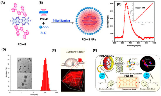 Various PDI NPs for bioimaging applications. (A) Chemical structure of PDI-49 and (B) formation of PDI-49 NPs from PDI-49 after micelle formation using F127. (C) Emission spectra for the PDI-49 NPs after laser exposure. (D) represents the TEM and DLS profiles for PDI-49 NPs. (E) A reconstructed 3D image showing the distribution of the PDI-49 NPs in the blood vessels of the mouse. The scale bar: 100 μm. (F) A schematic for the design and development of PDI-tagged amphiphilic PCL block copolymers and their nanoassembly formation (PDI-50 NPs) and intracellular enzyme-responsive bioimaging application. Reproduced with permission from [74,101], 2018, 2019 American Chemical Society.