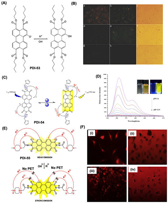 PDI-based pH sensors. (A) Chemical structure of PDI-53 and its pH-responsive switching mechanism. (B) Fluorescence imaging of E. coli stained with 50 mM PDI-53 for 1 h at pH 6.7 (a–c), 8.0 (d–f), and 8.9 (g–i). Images captured in the blue channel (460–490 nm) (a,d,g), green channel (530–590 nm) (b,e,h), and bright-field (c,f,i). (C) Proposed pH-sensing mechanism of PDI-54. (D) Fluorescence spectral variations of PDI-54 at different pH levels, with the inset showing color changes under UV light. (E) Chemical structure and pH response mechanism of PDI-55. (F) Microscopic visualization of PDI-55 micelles in living L929 cells after 24 h (top) and 48 h (bottom) of incubation at 1.3 µM (i,iii) and 26 µM (ii,iv). Scale bar: 50 µm. Reproduced with permission from [81,111,112], 2019, Elsevier; 2016, RSC Publishing group; 2019, Elsevier.