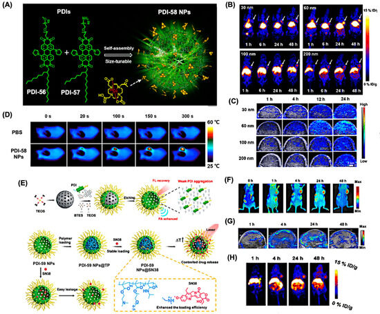 Theragnostic application of PDI derivatives. (A) Design scheme for PDI-58 NPs using the self-assembly method. (B) Decay-corrected coronal PET images of small animals captured at 1, 6, 24, and 48 h post-intravenous injection of PDI-58 NPs of varying sizes, with white arrows indicating U87MG tumors. (C) Merged coronal PA and US images of U87MG tumors obtained at 1, 4, 12, and 24 h following injection of different sized PDI-58 NPs. (D) Infrared thermal images of U87MG tumor-bearing mice under 675 nm laser irradiation (1 W/cm2) at 24 h post-injection of PBS or PDI-58 NPs. (E) Development and fabrication of PDI-59@TP-SN38 for multimodal imaging-assisted, light-triggered combined photothermal and chemotherapy. (F) In vivo FL images and (G) PA images of U87MG tumor-bearing mice at various time points post-injection of PDI-59 NPs. (H) PET imaging for the whole-body tracking of 64Cu-labeled PDI-59 NPs (arrow points at the tumor site). Reproduced with permission from [116,117], 2017 and 2019, American Chemical Society.