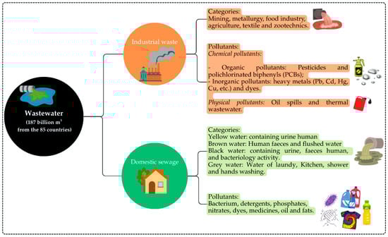 Population growth and industrialization have compromised water quality. Wastewater is the water that is thrown away after it is used in different processes. It can be classified as domestic or industrial, depending on where it came from. Dyes and textile products are the main cause of pollution. Each year, over 100,000 different synthetic dyes and pigments are made worldwide. Over 15% of these dyes are released into the environment, causing 280,000 tons of dye waste each year. Additionally, domestic wastewater is also a source of synthetic dyes [1,2,3,4]. Figure 1 presents the main sources of wastewater and their contaminants [5,6].
