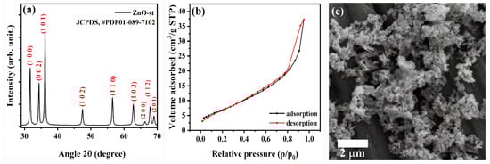 Characterization of ZnO-st obtained through thermal treatment at 600 °C for 2 h, using starch as fuel: (a) X-ray diffractogram, (b) N2 adsorption–desorption isotherm, and (c) SEM image.