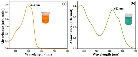 The dye solutions were analyzed using ultraviolet–visible spectrophotometry (Figure 4). The maximum absorption band for the orange dye was identified at 493 nm. For the green dye, two characteristic bands were observed: one at 381 nm and another at 622 nm. For the adsorption study, only the band in the visible region was monitored.