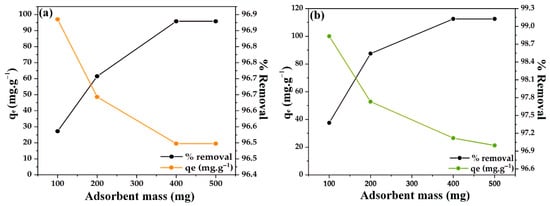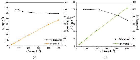 An inverse effect is observed in removal efficiency, which increases proportionally with the increase in dye concentration, reaching 47.45 mg g−1 for the orange dye at 500 mg L−1 and 51.88 mg g−1 for the green dye at the same concentration. Removal efficiency increases with higher initial dye concentrations because, as the dye concentration rises, more molecules are adsorbed per gram of adsorbent due to the increased number of collisions between dye molecules and adsorbent particles. The increase in dye concentration acts as a driving force for the adsorption process, favoring diffusion and mass transfer from the solution to the adsorbent surface [24,34].
