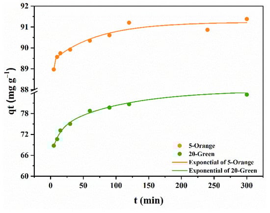 The summary of parameters and the regression coefficient (R2) for the two kinetic models is presented in Table 1. The pseudo-second-order models for both dyes provided the best fit for the data. For the orange dye, the R2 value was close to 1.00, and the calculated adsorption capacity was 91.32 mg g−1, which is close to the experimental value (91.23 mg g−1). For the green dye, the R2 value was 0.9997, with the calculated adsorption capacity from the model being close to the experimental value of 78.12 mg g−1. This kinetic model suggests the existence of chemisorption. However, since the adsorption phenomenon is a complex process, it is difficult to distinguish between physisorption and chemisorption based solely on this factor [36,37].