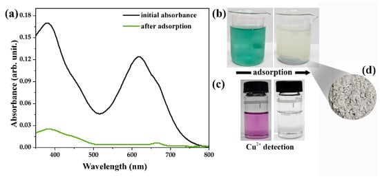 Co-adsorption test of co-adsorption by ZnO-st using green dye with copper II ions solution: (a) absorption band of the green dye before and after co-adsorption by ZnO-st; (b) solutions of green dye with copper II ions before and after co-adsorption study by ZnO-st; (c) photometric method (adapted EPA method) for copper II ion detection: before and after adsorption; and (d) ZnO-st in powder form after co-adsorption test.