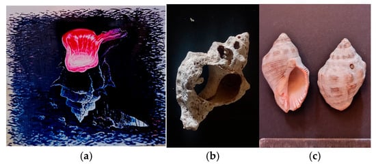 Tyrian purple seashell. (a) Fresco painting in a traditional tavern in Hermioni, where ancient ruins of manufacturing still exist (photo A. Tsatsarou) (b) Murex Trunculus shell broken to the point where the gland is placed. The shell was found in the ruins of within the archeological site Bisti, Hermione, Greece. (photo A. Tsatsarou) (c) Seashell Murex Haemastoma (photo A. Tsatsarou).