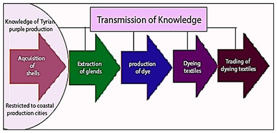 The expertise surrounding the production of Tyrian purple was not static but evolved dynamically over centuries, shaped by accumulated experience and the distinct environmental and logistical challenges of each region. Every phase of the production process—from the initial harvesting of mollusks in coastal zones to the final trade of the dyed textiles—underwent continual refinement in both spatial organization and technical execution [10,12].