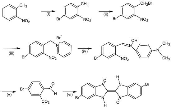 Synthesis of 6,6′-dibromoindigo. The reagents are: (i) Br2, Fe, (ii) N-bromosuccinimide, (iii) pyridine, (iv) 4-nitroso-N, N’-dimethylaniline, (v) aqueous sulfuric acid and (vi) CH2NO2, CH3ONa, Na2S2O4 (chem sketch drawn by A. Tsatsarou).