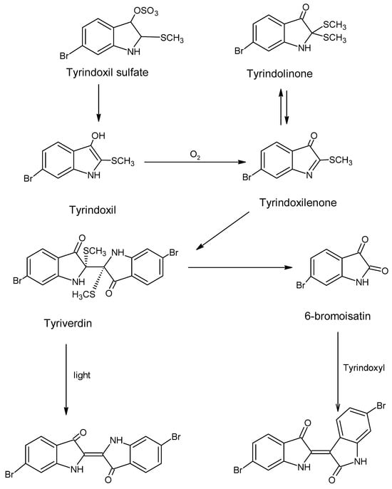 - Baker, J.T.; Sutherland, M.D. Pigments of marine animals VIII. Precursors of 6,6′-Dibromo-indigotin (Tyrian Purple) from the mollusc Dicathais Orbita Gmelin. Tetrahedron Lett. 1968, 9, 43–46. [Google Scholar] [CrossRef]