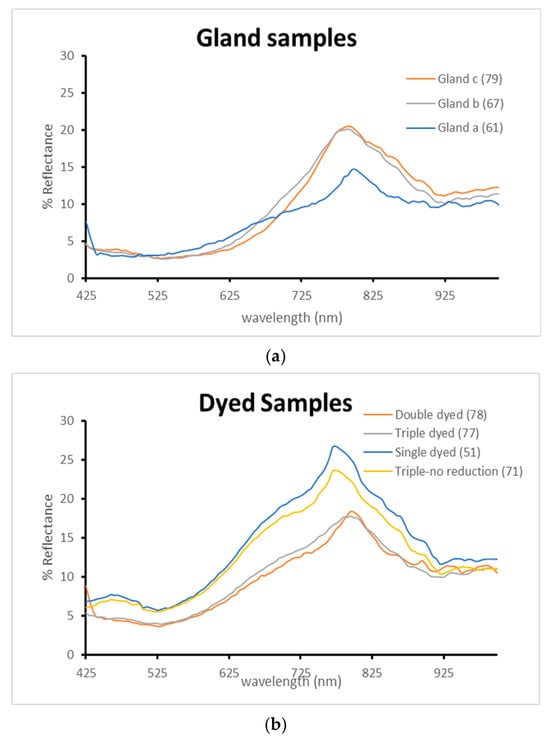 Reflectance spectra comparison. (a): Applied gland samples. (b): Dyed samples.