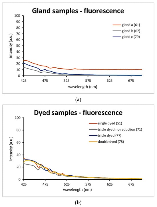 Fluorescence intensity spectra comparison of the dyed samples. (a): Applied gland samples. (b): Dyed samples.