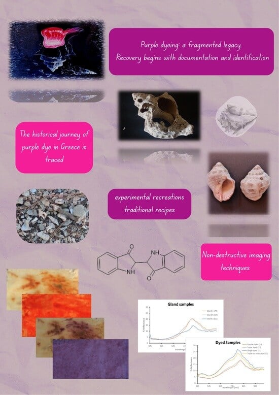 Due to the secrecy surrounding and extremely high price of Tyrian purple production in antiquity, the present research sought to recover and experimentally validate historical accounts of dyeing practices within the Greek region. The experimental procedures aimed to test and interpret the surviving literature while also exploring the chemical and optical behavior of the dye. Notably, Aristotle’s observation regarding photooxidation was confirmed: exposure of the crude gland to sunlight initiated a gradual color transformation, progressing from transparency to deep purple.